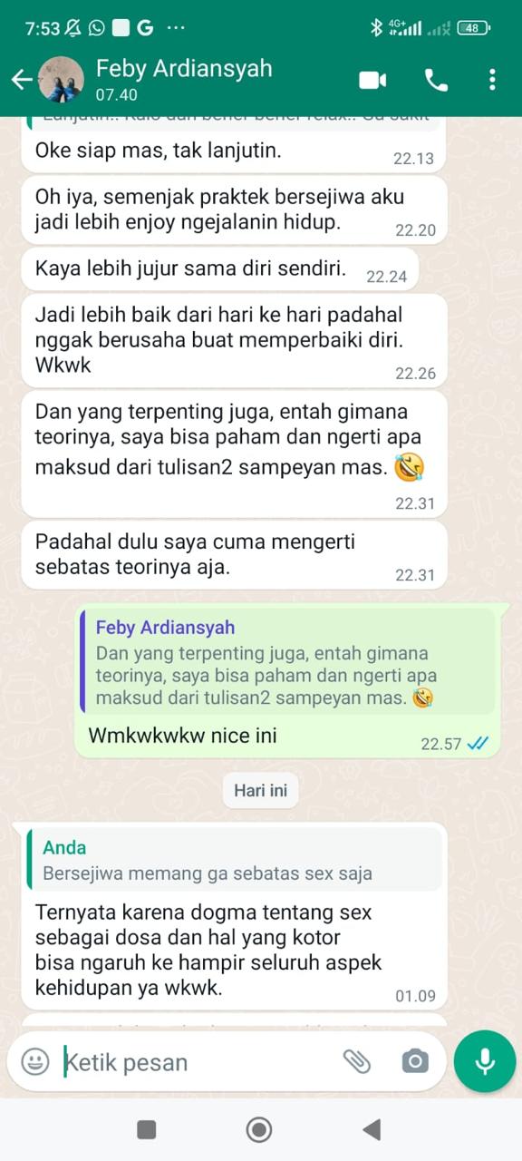 Hingga akhirnya 4 tahun lalu bisa praktek Valley Orgasme, dengan mengamati pola orgasme pada cewek …. saya bisa konsisten Valley Orgasme dan Tanpa Ejakulasi. Latihan yang saya lakukan sangat simple, latihan relaksasi yang bisa dipraktekkan cowok dimanapun. Bukan latihan senam kegel (kegel malah bikin ketegangan akibatnya gampang ejakulasi).