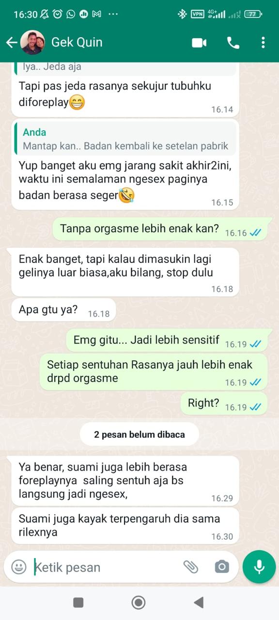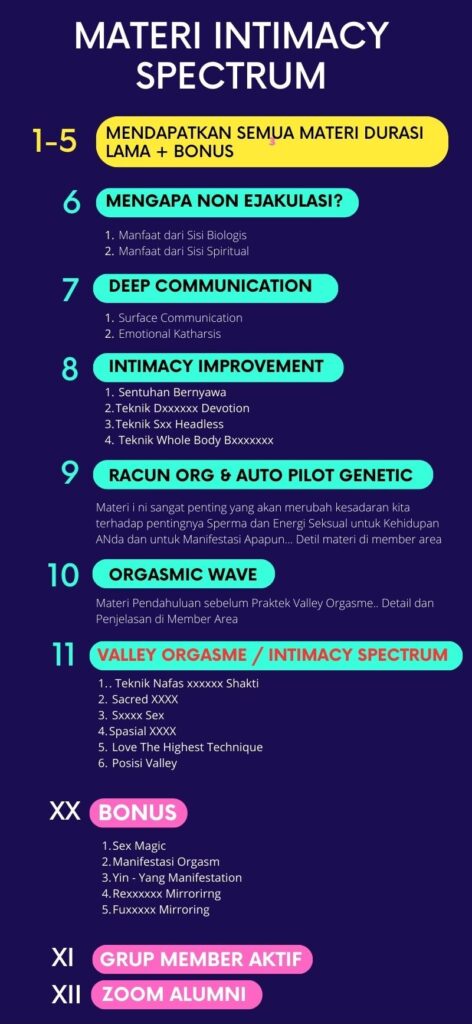 Dan Jika Anda sudah bisa minimal 30 menit, maka tahap selanjutnya kamu bisa praktekkan Valley Orgasme. Mengalami Orgasme sejak awal hingga akhir tanpa keluar sperma atau tidak ejakulasi..sehingga energimu tidak terbuang kamu siap berhubungan kapanpun dan berkali-kali tanpa capek.